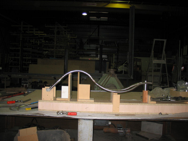 By using a carpenter's square, a vernier calliper, a tape measure and a plumb line I measured the entire set-up of the installation, and made a full-size drawing of it on my worktable. Because the position of the wheels, tubehead, chainrings, bottom bracket and seat were now known, it is easy to determine the curves for the frame. The wish to keep a straight chain-line (when the chain runs forwards) determents the lowest possible seat-height in combination with the wheelbase. Furthermore is the chain-line an important factor in determining the distance between the two frame-tubes. These frame-tubes run uninterupted from bottom-bracket-shell to the rear-wheelaxis. The chain crosses the frame at one point. Because I use a V-brake system and wanted it welded onto the frame, the frame had to bent inwards to make that possible. To avoid conflicts between chain and the rearfork, and to keep a small distance between the rear of the seat and the frame, the decision was made to bent the frame behind the seat upwards first before going down to the rear axis. This creates - with the 8mm or 5/16 inch connector-tubes - a very strong rearfork-like construction. After the sideview was finished, I drew the topview. After finishing all measuring and drawing I started constructing the mold. This was necessary for bending and welding of the 3 main-tubes of 22 mm / 0.86 inch.
